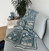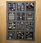 The blanket is made in interlocking crochet, a technique that consists of two crochet parts in different colors which are interlinked and thereby they form a relief picture.