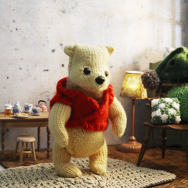 A bear most familiar; a bear who loves honey and is as honey coloured as the yarn he's knitted in.