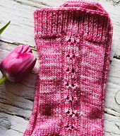 Tittygaga is a completely made up, but fun word. I thought it matched this whimsical design of round motifs that are inspired by our boobs. This design is rhythmic and easy to memorize which makes for an entertaining knit. The ribbing makes for a great fitting sock.