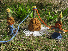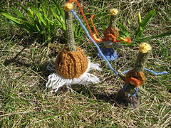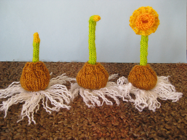 The bulb, the stem and the flower are all knit separately in the round on dpns. The bulb is knit from the bottom up. The roots are made by untwisting plies. The stem is knit in a tube and a pipe cleaner added to keep it stiff. To add the daffodil, bend over the top of the stem and insert it into the back of your flower.