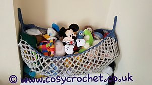It is quick to work up in super bulky blanket yarn and is very soft and stretchy to fit lots of toys in. It can hang up in different ways as shown in the pictures.