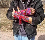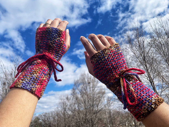 Written for the Minnesota Yarn Shop Hop ’24: Fairy Tales, these crocheted linen stitch mitts are inspired by how Minnesota-based author [Trung Le Nguyen][1] intertwines the past, the present, and the fantastical in his novel “[The Magic Fish][2].” An optional tie is woven through at the wrist and tied into a whimsical bow, reflecting the juxtaposition of fairy tale endings with a rough and tumble life.