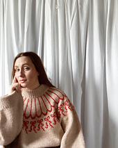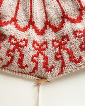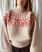 **Method**: This sweater is knitted top-down in the round in Stockinette Stitch. The round colourwork yoke is knitted following a chart, to create the bow & garland pattern. All edges of the sweater are knitted in rib, and are double layered.