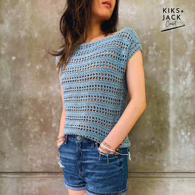This breezy short sleeve top is easy to wear, easy to crochet and super comfortable! This is a great alternative to a plain cotton T-shirt. Style it the same way but with a cotton crochet mesh top you will never have to worry about wrinkles or ironing. Throw this over shorts, jeans and wear it under slouchy cardigans as the weather gets cooler. Team it with a long maxi skirt to dress it up.