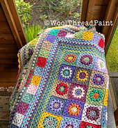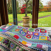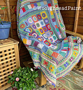 This pattern is for a crocheted throw, measuring 48 inches square. It combines a variety of simple crochet techniques including granny squares, bobble stitch, granny stripes and a scallop shell border.