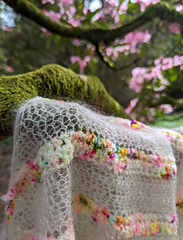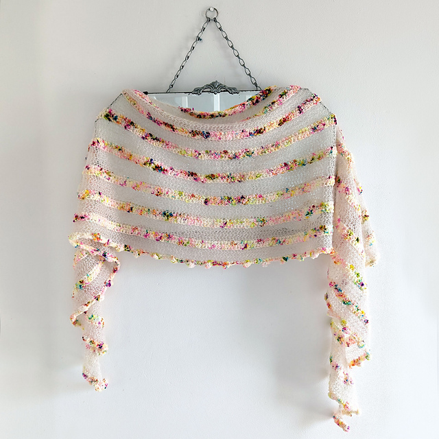 The inspiration behind this gossamer-light design is Yarnison’s Cloudy Nora shawl, a knitted crescent using boucle and mohair yarn.