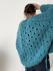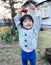 下に着る服の色が水玉模様になって見えるカーディガンです. 10円玉くらいの大きな穴が開いています. 身頃はぶかっとしたオーバーサイズに編み, 裾のゴム編みの手前で減らし目をして腰回りをキュッとさせます. 下にいろいろな服が着られるように太くて長い袖にしました. ジャケット代わりに羽織っていただけるカーディガンになればと思っています.