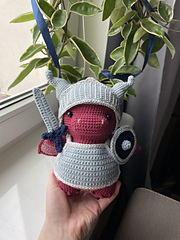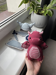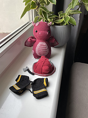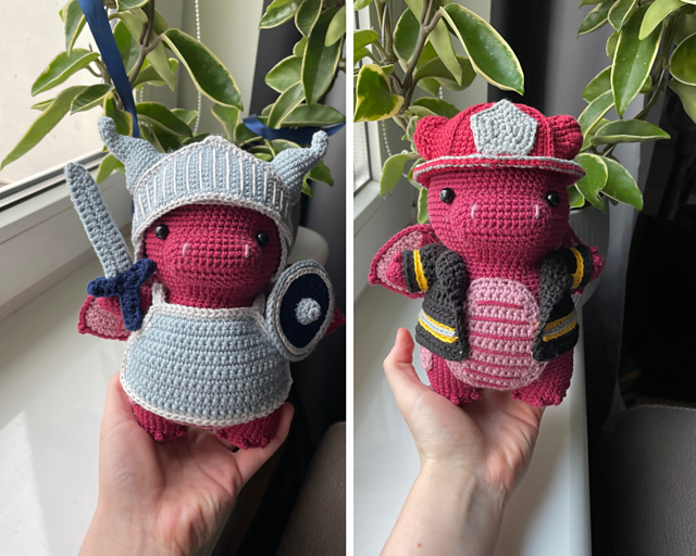 This is a PDF crochet/amigurumi pattern for a cute dragon who has two jobs - he's a firefighter and a knight. All of his accessories are removable.
