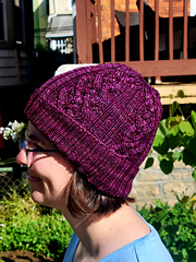 This hat fits my 22-inch (56 cm) head. Due to the stretch of the cables and ribbing stitch, I think it would fit about 20-24 inches (51-61 cm). To adjust the lenth, you could change the gauge, change the length the ribbing, or add or subtract a pattern repeat. My finished hat is about 11 inches deep, unfolded. I like long hats! Many testers preferred to omit a repeat.