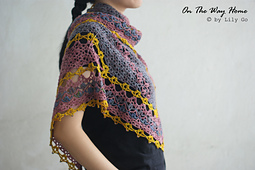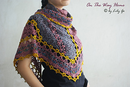 **On The Way Home** is an asymmetrical triangle shape shawl, worked from side to side. This shawl is designed to be crocheted in 3 colors. As with all my other patterns, this pattern comes with charts and row-by-row written direction in US crochet term. You can work entirely from the written direction or from the charts alone.