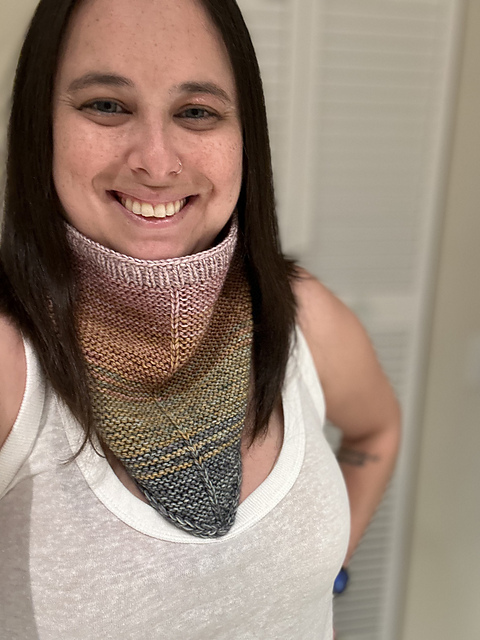 This wonderfully squishy bandana cowl is worked seamlessly from the bottom point up, stitches are cast on and it's joined and finished in the round.