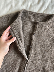 My Dream Cardigan is quite a minimal, yet detailed cardigan. It’s worked top down in the round with a saddle/contiguous shoulder construction, and is then cut open (steeked) at the front. It has a slightly oversized fit around the body and a more narrow sleeve that’s shaped with decreases. The bottom of the body and sleeves has a double rolled edge, and the visible button band has a similar construction to mimic them. The steek sts are seamlessly covered with a knitted edge, so there’s no need for any additional woven button band. Lastly the neckline is made with a neat double folded edge.