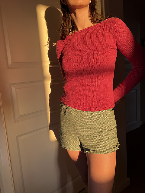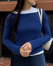 The **Breezy Longsleeve** (Version A) is a fitted top with a wide boat-neck style neckline and extra long and narrow set-in sleeves. The sleeve caps are shaped using short-rows. You will need to be able to work German short rows to knit this. It is suitable for an intermediate knitter or confident beginning willing to learn new techniques. The longsleeve is finished with 1x1 ribbing but you can, of course, use the instructions from version B for an I-cord edge.