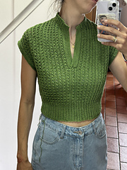 La maglietta Rosemary si lavora con righe di andata e ritorno da lato a lato. Il dietro e il davanti vengono lavorati separatamente, vengono rifiniti poi cuciti insieme sulle spalline e ai lati con una cucitura decorativa all’uncinetto. Il girocollo è rifinito con un bordo a coste 1/1 lavorato all’uncinetto.