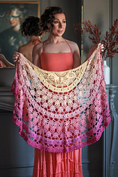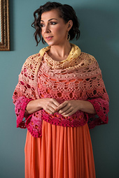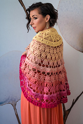 This shawl, which is inspired by Alectrona, the goddess of sunrise, captures the beauty of our sunrises. As you work, you will hold two strands together. Sometimes it will be two strands of the same color, and sometimes it will be two different color strands, which creates a marled effect. I hope you enjoy my sunrise.