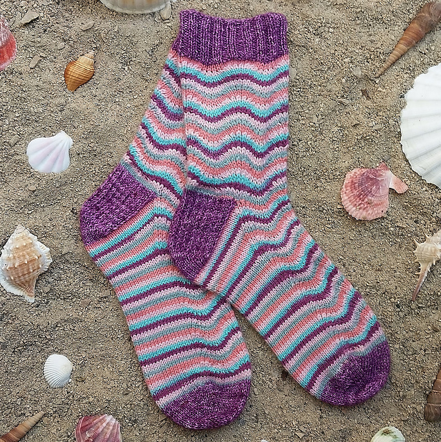 Ocean waves and the mermaids who swim in them were the inspiration for these socks. This pattern is written cuff down with magic loop and a heel flap and gusset. Self striping yarn is a great choice to show off the gentile wave pattern.