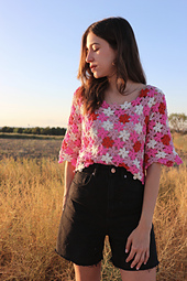 The Flora Tee is a cute and feminine statement piece that will add a little flair to your wardrobe. The tee is crocheted in one piece, with the first flower made separately and every flower after that joined as you go. This means, no sewing!