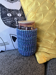 Worked from the top down, this cozy tapers as you reach the bottom for a close fit to the popular shape of to-go fast beverage cups. While gauge is not critical, aim for a tighter gauge rather than a looser one. The ribbing adjusts to fit.