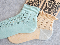 This pattern includes two types of lace socks: Chamomile Socks and Vanilla Bean Socks. They are worked from the toe up. The short-row heel is designed to minimize gaps and holes in the turned place. Because of the mini gusset in the sole, a larger heel can be made than a typical short-row heel. Directions are written for the magic loop method with circular needles. The stitch pattern of the sock top is charted only. Video tutorials are included.