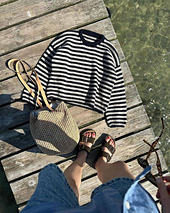 The Olga Sweater is worked from the top down in stockinette stitch with stripes. First, the back yoke is worked back and forth with the slope of the shoulders being shaped using short rows and in stripes, which are worked at the same time. Each shoulder is then worked back and forth on a circular needle, and then the shoulders are joined to form the front yoke. The front and back yoke are joined at the underarms to form the body, which is worked in the round on a circular needle with stripes. The sleeves are worked down from stitches that are picked up and knitted around the armholes. At the end, a folded neck edge is worked from stitches that are picked up and knitted along the neckline.
