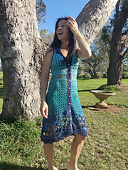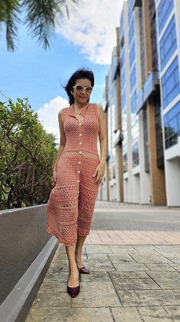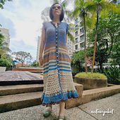 The GarDenise dress can be made long or short, with or without collar, with or without sleeves plus many other options. It is made top down with the back panel being made first before the front left and right panels. Once you reach the required armhole size, these will be joined and made in turned rows to the end. After which plackets will follow and collar and sleeves are optional and will be made directly onto the garment hence the only sewing you need is for the buttons! The order of the stitches to be used can be customised to your very own preferences too.