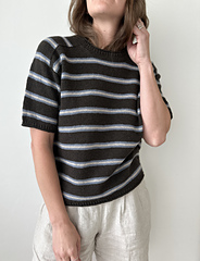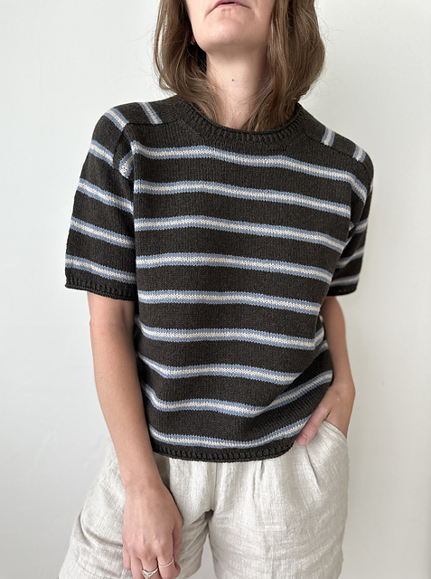The Lakes Stripe Tee is worked from the top down. The saddle shoulders are shaped for a comfortable oversized fit, adding a structural element. The tee features shaping at the most important parts of the garment to create the best fit. It features a classic stripe pattern that is perfect for summer days.