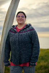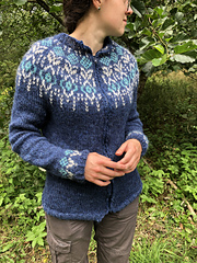 Around the world is an Icelandic lopi yoke sweater with a hood and zipper. Knitted in the round from the bottom up and steeked. Back knitted higher. Optional waist shaping. Hood can be ommited. High hip lenght but can be made longer. The sweater comes in sizes XS to 5XL. It is a quick knit, worked on big needles at a relatively loose gauge with my favorite Icelandic wool blend: a single strand of plötulopi together with my fine lambswool lace Love Story.