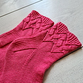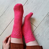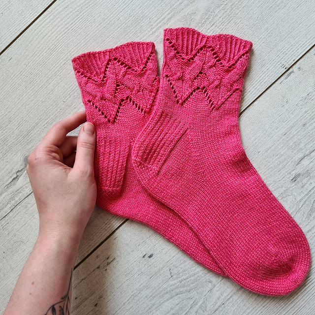 The Loretta socks are worked from the cuff down, with a textured cuff made of half twisted rib, cable and lace which blends into stockinette. The pattern includes 2 heel options to choose from, Charted and written instructions.
