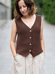 City Waistcoat is worked from the top down. First, the back yoke is worked back and forth and shaped with short rows for the shoulders. Then, the shoulders/fronts are worked from stitches that are added along the top of the slanting parts of the back yoke. The body with buttonholes is worked back and forth. Then the edging is added.