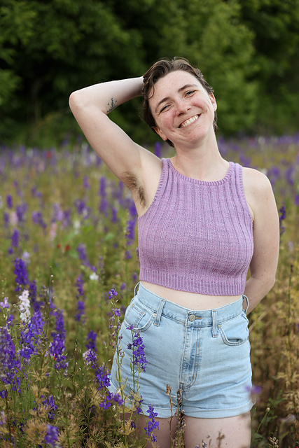 The Iris Top is a fitted crop top featuring bold ribbing and neat finishing details. Negative ease and waist shaping give this garment a body-hugging fit. Knit up in a fingering weight yarn, this is a great piece for adding to your handknit collection for the warm season. Worked in a bright color this design can be a playful statement piece or in a neutral color it can be a perfect staple piece in your me-made wardrobe.