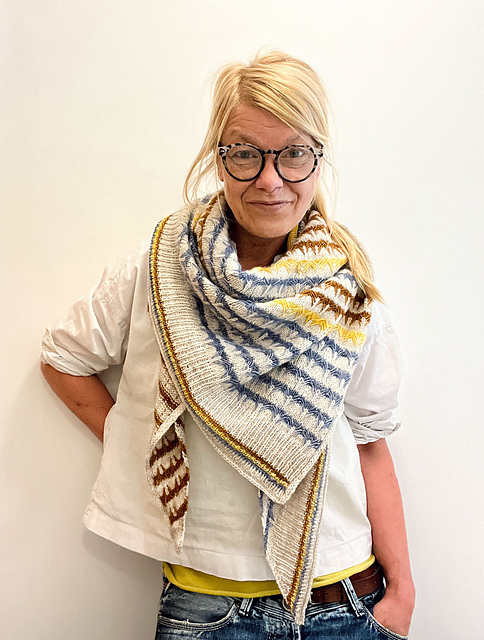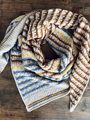 The PORTO CONNECTION shawl is worked flat (sideways), increasing along one edge to create a slightly asymmetrical triangle. Stitches are increased in pattern and then onward into the 1x1 ribbing. The slip stitch stripe design means that you only work with one color on any given row. The combination of easy slip stitch pattern stripes and the ribbing give this shawl a sophisticated yet casual look.