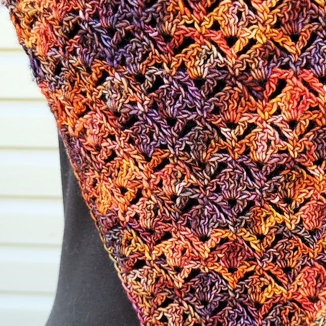 I happened to have one such hank of Malabrigo Yarns Mechita that was begging to be made into something. After much trial and error, I found that the crowfoot lattice stitch matched perfectly with the beautiful randomness that embodies so many hand-dyed yarns. I hope you love it as much as I do.