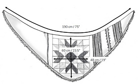 Approx 190 cm / 75” along the top edge of the shawl and 60 cm / 23.5” deep.