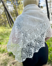 The Südame Hap comes in two sizes and is worked seamlessly. This beautiful eye catcher is knitted from the center outwards, using the traditional square shape, with a center panel in a simple squishy garter stitch. The square is worked from one point of the diamond to the opposite point (knitted diagonally back and forth). You start by increasing the first half, and then you decrease for the second half. After that, stitches are picked up around the edges, and Estonian lace with double nupps diamonds is worked outwards from the center square and knitted in the round. Finally, the shawl is bound off with your favorite bind off method (I used Picot bind off.
