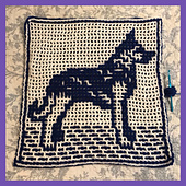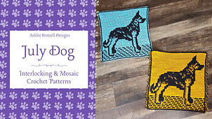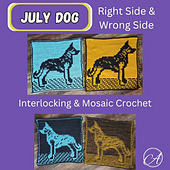 July Dog is our seventh pattern in the *2024: A Year of Dogs* series. This large square features a handsome German Shepherd. Each month's design can be made using interlocking crochet or overlay mosaic crochet.