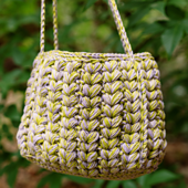 **Pattern Information:** Vitreous is worked from the base upwards. The base is a flat rectangle made up of slip stitches, and the body of the bag is made up of puff stitches worked in the round upwards from the base. Straps are applied to the sides of the bag from the bottom up.