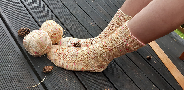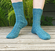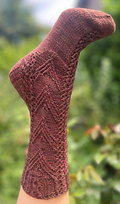 Migration is inspired by, obviously, the Vs of birds every autumn that wing their way south. The sides of the socks have the V-shape, but the front and back are covered with lacy vines reminiscent of the bare branches at the end of autumn that cover the forest floor where I live.