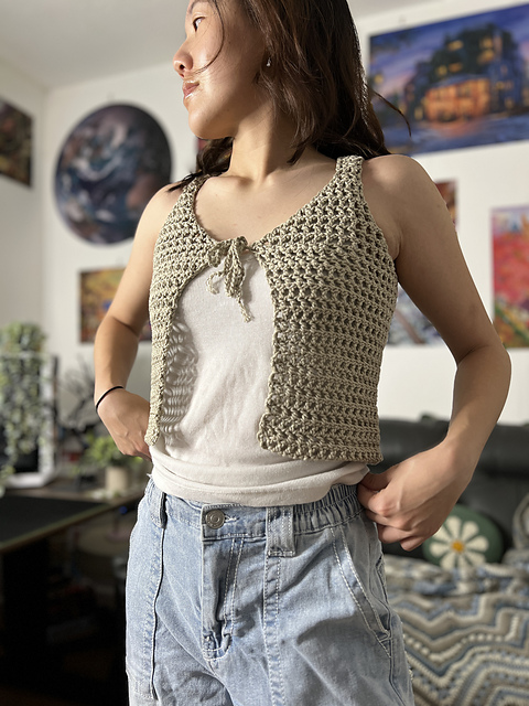 This pattern makes an x-small crochet mesh vest. The italicized notes within the pattern let you know when and what to adjust to get a different size.