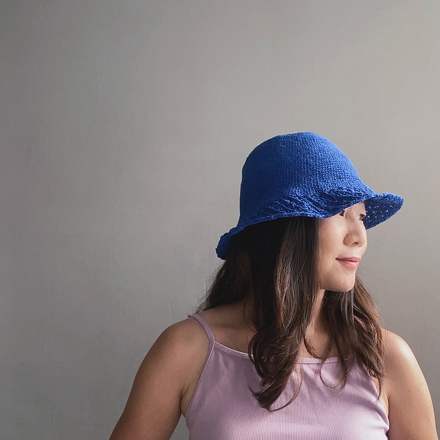 Itobatake washi (Japanese paper) yarn used in this design is washable, making it a practical yarn for a summer hat. The hat is lightweight and retains its form if you crochet at the recommended gauge. If you substitute with a heavier or drapey yarn, you may get a different outcome with the brim.