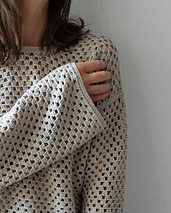 The sweater is crocheted from the bottom up in a granny-type cluster pattern. First, the Back is worked in back-and-forth rows with turning, then the Front. After this, the shoulder seams are closed with slip stitches to join both pieces. The sleeves are crocheted directly onto the Body and likewise worked in back-and-forth rows with turning.
