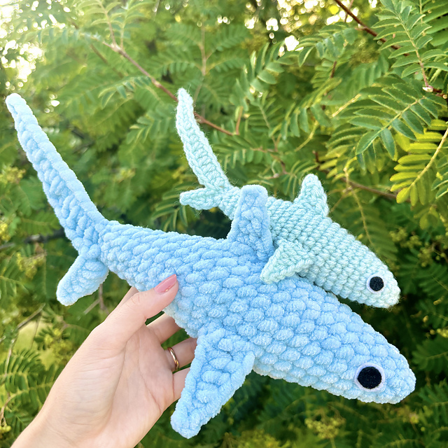 Thresher sharks are known for their distinctive long tails, but what I love most about them are their almost cartoonish eyeballs :) This love for their derpy, anxious looks inspired me to make a pattern in their honor!