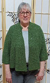 The sample made in the mentioned yarn has 78 rows, including the edge, and measures 300 cm around the outer edge and 60 cm or 23.5" in width, after blocking.