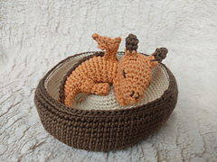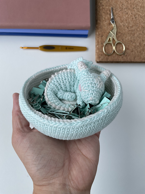 The instructions are written in **US crochet terms**. There are step-by-step photos detailing how to make the pieces and finish the toy. When made with DK weight yarn and 3.0mm hook the finished bowl will measure about 13cm/5in wide and the dragon will measure around 8cm/3in long when curled up.