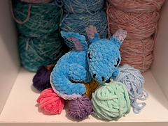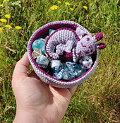 The bowl and the dragon are made separately and are sewn together during assembly - this way the dragon will always be raised above the items in the bowl, sleeping on the pile of treasure. The dragon is made in pieces, and to get the tail to curve a half-double crochet stitch is worked in the middle of each round, forming the spine. After the dragon is assembled, a decorative row of crab stitches (reverse single crochet) is added along the spine, adding a bit of texture.