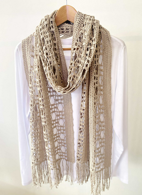 It can be made in two ways, as a typical scarf or wider and longer to work as a shoulder wrap to drape around you on cooler summer nights.