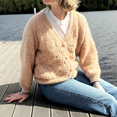 Evina cardigan is a knitted cardigan with crochet granny squares. The granny squares are sewn together to form the body. The yoke and sleeves are knitted bottom up and joined with raglan. Finish off with a double knitted button band.