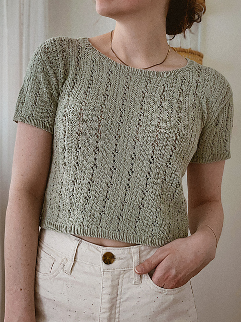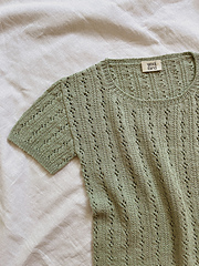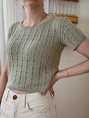 The Fleur Tee is worked bottom-up in the round, beginning with an italian tubular cast-on and 1x1 ribbing at the hem. The entire project is worked in a pointelle pattern. The body is knitted to the desired length, then split to work the front and back separately. The neckline is made by placing some stitches on hold while working 1 shoulder at a time. The front and back pieces are seamed together, then stitches are picked up around the neck opening and knitted in 1x1 ribbing. Stitches are picked up around the armhole opening and short rows are worked to create the sleeve shape, then worked in the round to the desired length of sleeve, and finally finishing in 1x1 ribbing.