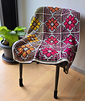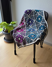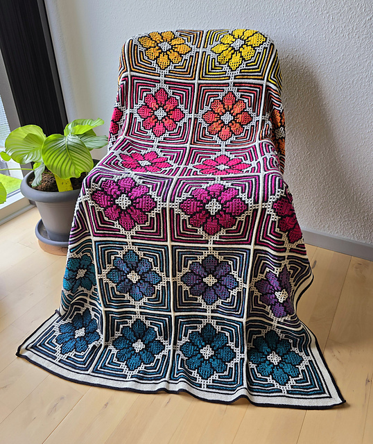 The blanket is crocheted using the overlay mosaic technique. Although it might look difficult, it is made using simple dc and sc stitches.