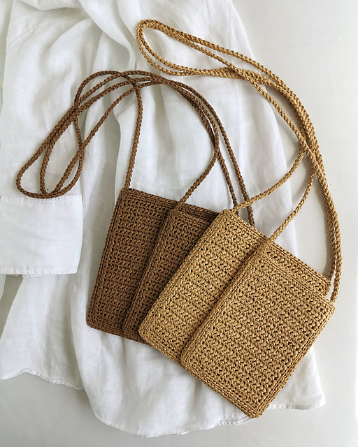 Die Tasche wird in zwei Teilen mit festen Maschen gehäkelt und abschließend werden beide Teile mit Kettmaschen zusammengehäkelt. Die Anleitung beinhaltet zwei Größen sowie eine Variante aus Raffia und eine aus Baumwolle. Die Raffia-Variante ist formstabiler und robuster, das Material ist jedoch etwas „anstrengender“ in der Verarbeitung. Die Tasche aus Baumwolle ist nicht ganz so stabil bzw. ‚standfest‘, dafür aber angenehmer zu häkeln.