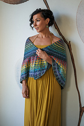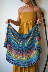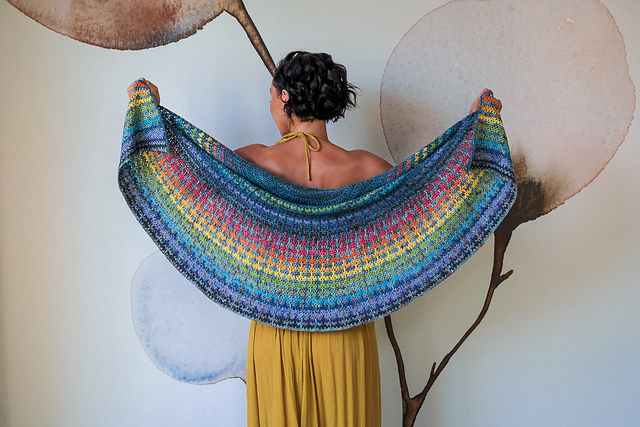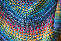 Nuanua means "rainbow" in Samoan. The body of this semicircular shawl is crocheted in linen stitch, which is simply alternating single crochet and chain stitches, working the next row's single crochet stitches into the previous row's chain spaces. Front post double crochet stitches create vertical stripes across the many colors of horizontal stripes, and colors change only at row ends. Just six increase rows are spaced throughout the body so that you can enjoy playing with colors without worrying about an ever-changing stitch count.